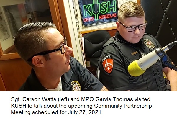 (Cushing, Okla) — Cushing Police Department is inviting the public to the Senior Citizens Center, 203 E. Cherry, Tuesday, July 27, 2021 from 6 – 7 pm for a Community Partnership Meeting. The open forum will allow citizens to meet the officers, raise any concerns and ask questions.